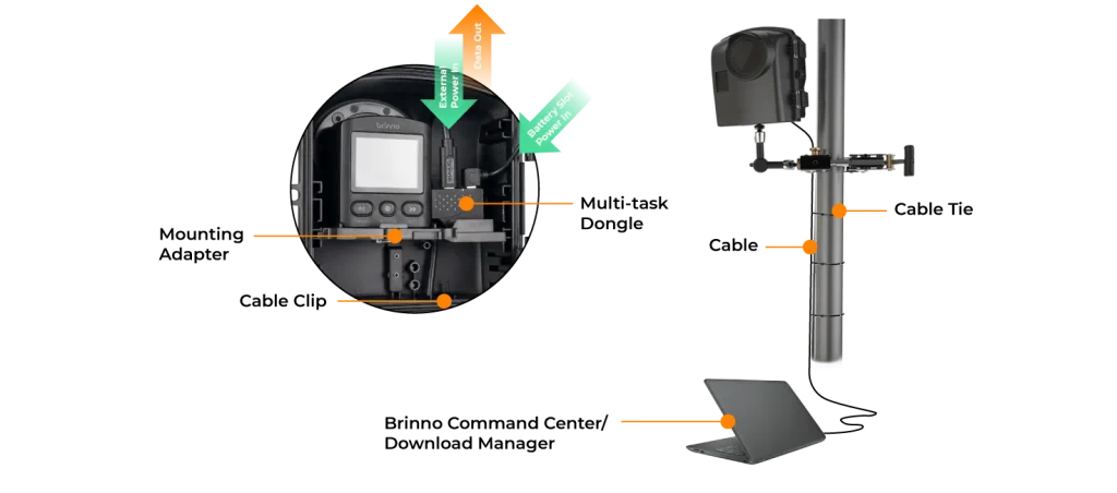 Give yourself a boost. With the 32ft (10m) long cable get instant access to your camera. Download files onto your laptop and use the new Brinno Command Center to modify camera controls and check filming and battery status. For a truly flexible installation experience, the cable can also be used to connect your camera to external power through a power adapter.